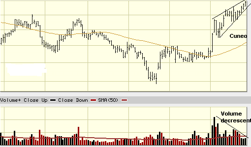 Una avvertenza, che ritengo la parte più importante del breve incontro di oggi: quando vi trovate di fronte a due trendline entrambe crescenti ma convergenti, e assistete a una diminuzione di volume vi trovate di fronte a un cuneo (wedge). Questa è una delle formazioni più sinistre: le probabilità sono che, entro i due terzi della sua lunghezza, la trendline inferiore venga penetrata, e ne segua una violenta mossa verso il basso.
